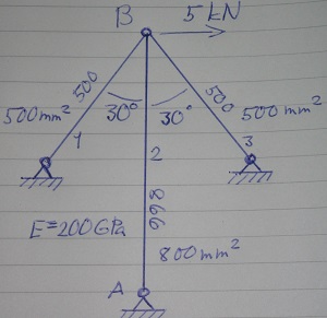 Ohessa on tenttitehtävän tehtävänasettelua esittävä osittain muistinvarainen piirros. Keskimmäinen sauva kaiketi oli tarkoitetty pystysuoraksi, vaika en muistakaan miten se oli osoitettu. Kun kyse on sauvarakenteesta niin sille ei tietenkään vaadita mitään taivutusmomentti- ja leikkausvoimapiirroksia, mutta solmun B siirtymät, vapaakappalekuvat, sauvojen normaalivoimat ja tukireaktiot täytyy selvittää.