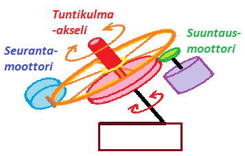Alustavasti ajattelisin että tuntikulma-akselin osalta toteutus voisi olla periaatteessa oheisen piirroksen kaltainen. Lisäksi tietysti tarvitaan deklinaatioakseli joka on kohtisuorassa tuntikulma-akseliin nähden. Suuntausmoottori pyörittää tuntikulma-akselia hammaspyörän kautta ja sen päällä on laakeroitu jatkoakseli jota pyörittää seurantamoottori ruuvin ja matopyörän kautta. Onhan se aika hankala rakenne sinänsä. Seurantamoottorin täytyisi pyöriä alemman akselin mukana.