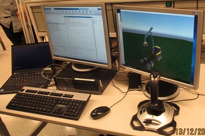 Tampereen yliopiston työkoneautomaation kurssi vaatii nyt melkoisen paljon panostusta, vaikka siihen ei sisälly lainkaan oikeaa hydrauliikkaa. Mekaniikkaa on aika vähän. Enimmäkseen kyse on ohjelmallisesta simulaatiosta. Oheisessa kuvassa on tutustuttavana Simulink Real-time kokeilulaitteisto. Tavoite on ohjata oikeassa näytössä näkyvää metsätyökoneen visualisointia (tai havainnollistusta) näytön edessä olevalla joikkarilla jossa on 4 analogista akselia ja lisäksi 12 ("digitaalista") kytkintä.