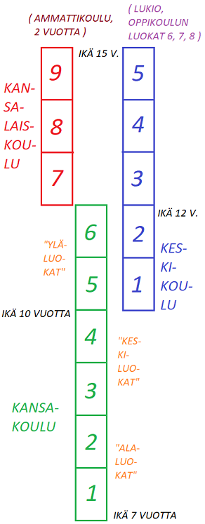 Koetan ohessa havainnollistaa graafisesti oman lapsuuteni aikaisia kouluja. Vuosiluku tässä on suunnilleen 1968 ja sama tilanne oli ehkä sitä ennen vallinnut jo parinkymmen vuoden ajan? Tämä on siis ajalta ennen paljon kohua herättänyttä peruskoulu-uudistusta. Oli kai peruskoulu sikäli hyvä uudistus että tuo sosiaalisesti ongelmallinen jako "kansalaiskoulu versus keskikoulu" poistui perusopetuksesta. Eipä tuo silti lie maailman kaikkia murheita pois korjannut, vaan vielä nykyisinkin pystyy porajamaan ja pillittämään (itkemään) monesta asiasta jos niin tahtoo.