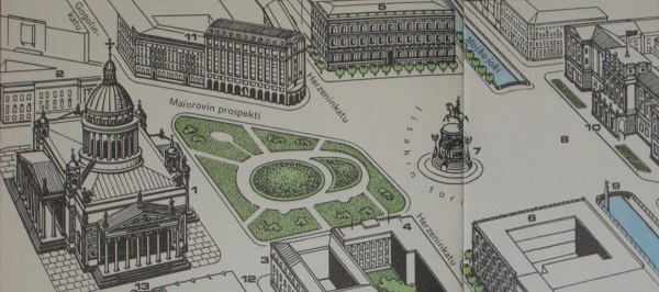 Hotellimme oli Iisakin kirkon aukiolla kirkkoa vastapäätä. Oheisessa suunnilleen samanaikaisessa havainnollisessa piirroksessa Iisakin kirkko on merkitty numerolla 1.