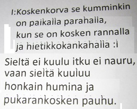 Tosin mumma lauloi sanoista vain tuon ensimmäisen osan. Epäselväksi minulle jäi mikä on se koski, josta laulussa mainitaan. Sanojen jatko-osan mukaan kyseessä olisi Pukarankoski, minulle täysin tuntematon suuruus.