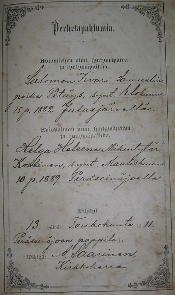 Lisäänpä tähän otteen noin 138 vuotta sitten, päiväyksellä 15.08.1882 syntyneen paappani (isän isä) Salamonin ja vaimonsa Helga Heleenan 109 vuotta vanhasta vihkiraamatusta, todistaakseni että minulla on perusteita vaatia faktisia Jalasjärveläisiä juuria ja kunniallista syntyperää.