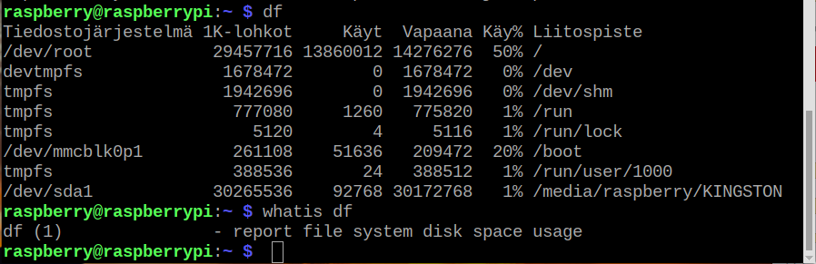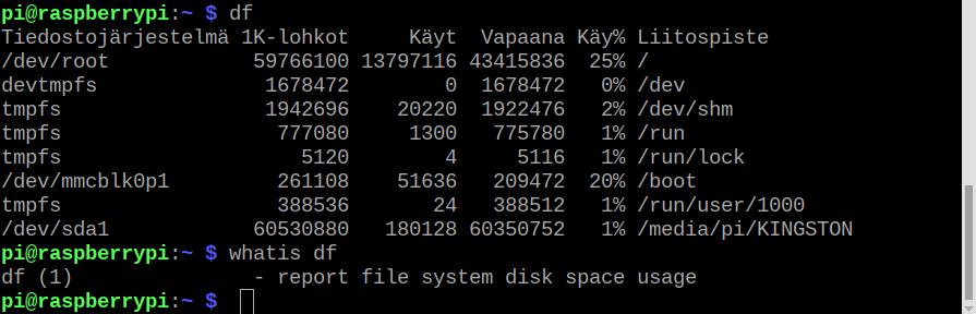 Alla taas tietoja RPi 4 -koneesta jossa on (nimellisesti) 64 GB kortti järjestelmälle ja myös (nimellisesti) 64 GB muistitikku USB-liitännässä. Formatoitu kapasiteetti on aina hiukan pienempi, mutta ilman formatointia tiedot menevät hukkaan. Kuten näkyy, vie täysi asennus neljäsosan sille käytettävissä olevasta muistista.