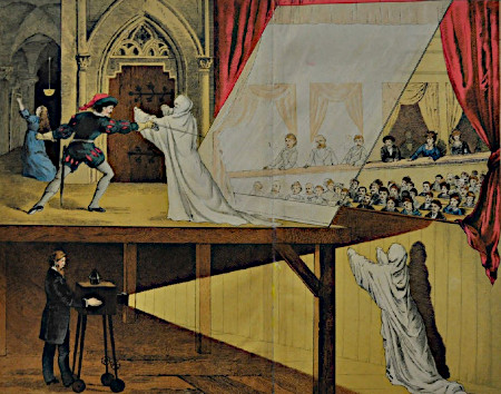 Miten entisaikaan voitiin teatterissa yleisölle esittää aave tai haamu, jota vastaan peloton miekkailija taistelee?