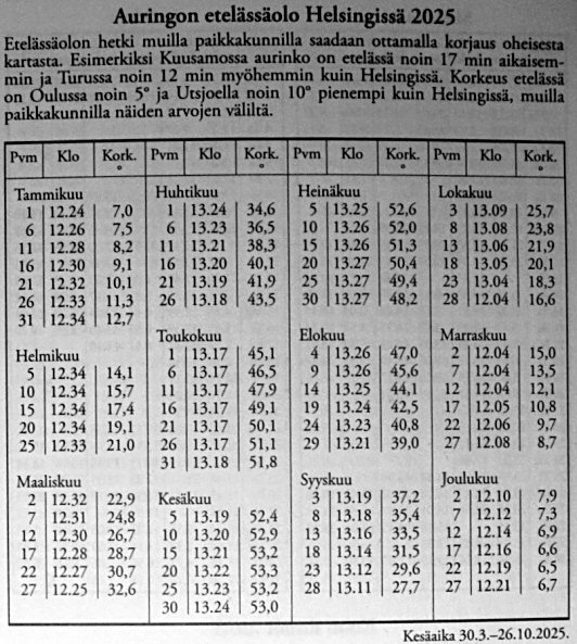 Ylläoleva ote vuoden 2025 almanakasta auttaa varmistamaan että paikallisen keskiaurinkoajan ja tosiaurinkoajan välinen ero on kesällä pieni, tavallisen aurinkokellon kannalta lähes merkityksetön. Päiväykselle 15.06.2025 on ilmoitettu että Aurinko on Helsingistä katsoen etelässä kello 13:21 Suomen kesäaikaa.