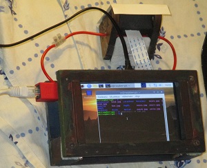 En ĉi tiu eksperimento la labora tablo en la programa fenestro de 10-cola montrilo estas la labora tablo de RPi3 kun tre malgranda 5-cola montrilo. Ĝi aperas iom pli granda en la 10" montrilo pro io kialo. Sube vi vidas foton de tiu tre malgranda 5-cola montrilo kiu kaŝas kartan RPi3 -komputilon malantaŭ si.