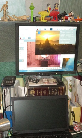 Kaj jes, bone funkcias la programo en PC/Windows kiel la apuda foto atestas kun la ekstera 19-cola jam antikva VGA-montrilo de mia malnova portebla PC. Akumulatoro de tiu antikva portebla PC ne plu funkcias. Eblas samtempe vidi multaj laboraj tabloj de distancaj komputiloj kiam oni uzas la bonajn servojn de afabla aparato Ethernet Switch.