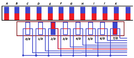 Ni komencu el la apude desegnita pozo de motoro. La plej maldekstra fiksa elektromagneto (0/8) estas plej proksima al magneto de rotaciebla cirklo. Samtempe la dua elektromagneto estas iom (1/8) pli distanca el dekstra magneto de cirklo. La tria elektromagneto estas iom pli (2/8 = 1/4) distanca el magneto de cirklo. La kvara elektromagneto (3/4) estas ankoraŭ iom pli distanca.