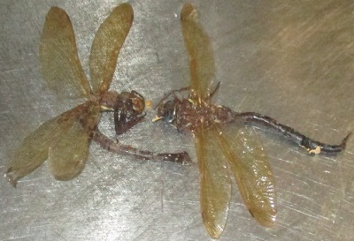 Mi trovis en korto du mortaj grandaj libeloj flanko ĉe flanko. En la apuda foto ili kuŝas endome sur la brila metala surfaco de mia vazlavkompleto. Mi iliajn korpojn respektante konservos kiel unu kara rememoro pri pasinta somero, kvankam somero ne tre gaja, somero vana, neutila, veinda, perdita.