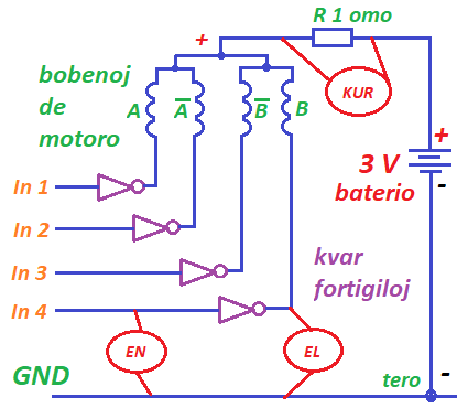 La situacio tamen ne estas vere tiel malbona. Mezurilo atestis ke rezistanco de duona bobeno estas proksimume 5 Ω - anstataŭ la tezo nur ½ Ω de vendisto - kaj se mi uzas nur 3V baterion kun 1Ω seria reostato (por mezuri la tension kaj kalkuli la kurenton) kaj la fortigilo uzas almenaŭ 1 volton da tensio, kredeble restos malpli ol 2 voltoj por la bobenoj de motoro. Kredeble la elektra kurento por unu duono de bobeno pofoje do estos klare malpli ol 0,5 amperoj, eble nur proksimume 0,3 amperoj? Do nenia tre granda risko pri tro granda kurento por la fortigileto.