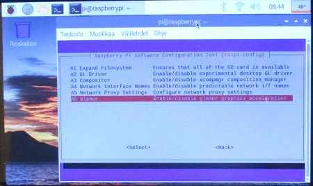 Eble tiuj programoj funkcias jam rekte por RPi4 sen aliaj agoj, sed por aliaj varioj de RPi oni provizore bezonas por selekti apartan 'grafikan plirapidigilon' "Glamor" kion oni povas fari malnovstile kun raspi-config proksimume ĉi tiel: