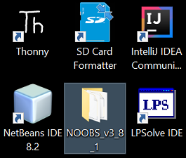 Do mi trovis la plej novan NOOBS v3.8 en la komputila reto (anstataŭ la v3.7 kion mi uzis antaŭe) kaj uzis ĝin en alia PC-komputilo. Mi selektis la "Full" -alternativon kion la NOOBS-paketo proponis, kvankam mi ne vere bezonas ĉiujn tiujn grandajn programojn. La "Full" -alternativon oni tamen povas unue munti rekte el la NOOBS kaj ĝi almenaŭ antaŭe bone kaj senprobleme funkciis.
