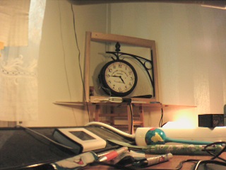 Apude estas (iom malgrandigita kaj pli bone pakita) la unua foto - nomita foto1.jpg - kion mi fotis el mia labora tablo per la supre fotita USB-fotilo per la fswebcam -programo. La granda horloĝo estis relative bone lumigita per du fortaj lampoj. La 6 LED-oj tute ne estas kapablaj al tia lumigado.