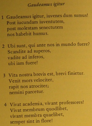 Ni certe havas aliaj altaj valoroj ol Biblio. Ekzemple la latina lingvo estas por ni tre valora. La sube fotitaj unuaj vortoj kaj la komencaj versoj de fama kanto Gaudeamus igitur [ ... iuvenes dum sumus! ] estas latine.