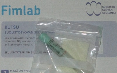 Nu, fakte temas pri testo de intesta kancero. Nome oni ordonis ke 60 - 68 jaruloj sendu provaĵon de feko per poŝto al laboratorio. Kredeble intesta kancero estas iom aktuala temo por testi por mia propra aĝogrupo.