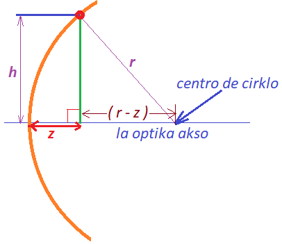 Unu centre grava afero por sfera spegulo estas la "sagitta" z, kion oni povas kalkuli per formulo z = r - (r2 - h2)1/2 kie mi prezentas kvadratan radikon per la eksponento ½ (duono).