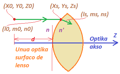 La lumradio startas el koordinatoj (X0, Y0, Z0) kaj la originaj "direction cosines" estas (l0, m0, n0) en la sama ordo. Unue ni laboras kun la unua optika surfaco kie la en aero fluganta lumradio trafas la vitron de lenso en koordinatoj (Xs, Ys, Zs) kaj post refrakto en la surfaco la direkto de lumo en la vitro estos (ls, ms, ns).