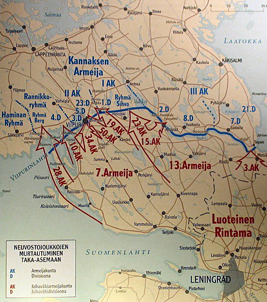 Finnaj divizioj estas prezentitaj en blua koloro kaj la sovetuniaj en ruĝa koloro. La plej granda militista premo estis direktita al la direkto de finna la urbo "Viipuri", iam la dua plej granda urbo en la lando.