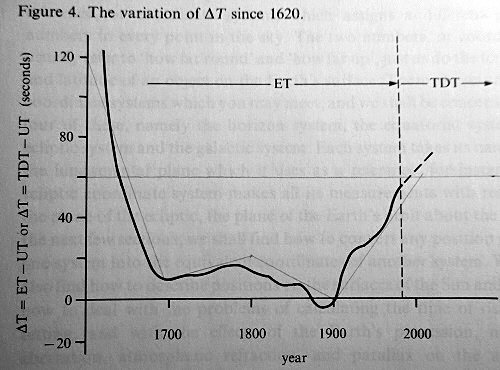 Supre tamen estas informa diagramo pri ΔT = ET - UT el la libro de Peter Duffett-Smith por jaroj ek de 1620. Ni vidas ke ΔT estas pozitiva kaj la dinamika tempo ET do estas proksimume unu minuton (60 sekundoj) da tempo pli multe ol la norma UT. Kredeble eblas kalkuli la valuon de ΔT nur el observoj kaj estas malfacile por antaŭdiri akurate.