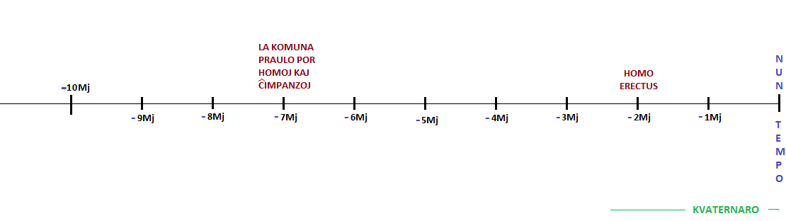 La komuna praulo de homoj kaj ĉimpanzoj vivis en orienta Afriko proksimume 7 milionoj da jaroj antaŭe kaj la dupieda stara pozicia homo erectus aperis proksimume 2 milionoj da jaroj antaŭe.