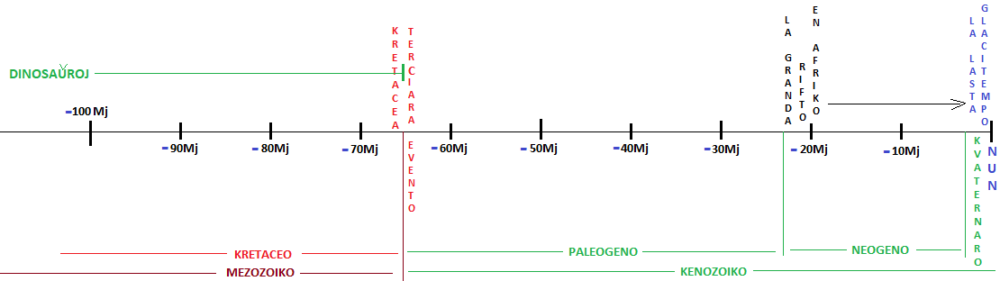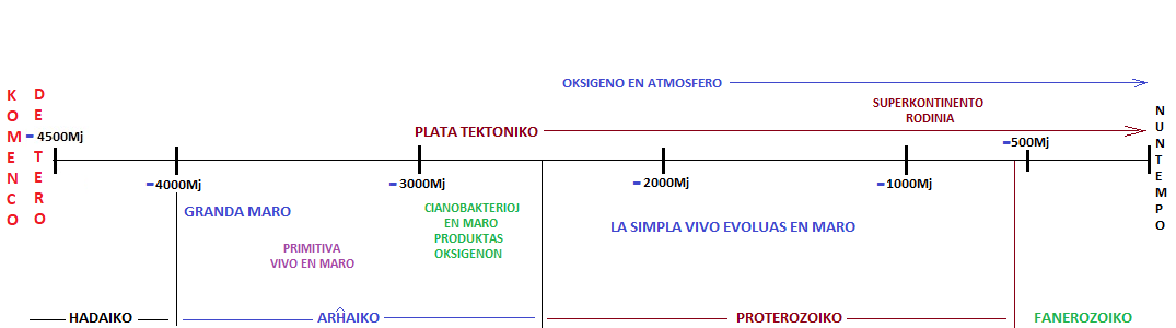 La temposkalo de Tera historio ja estas longega. Mi uzas Mj kiel mallongigo por miliono (mil miloj, 1000*1000) da jaroj. Miliardon (mil milionoj, 1000*1000*1000) mi ne intencas uzi.