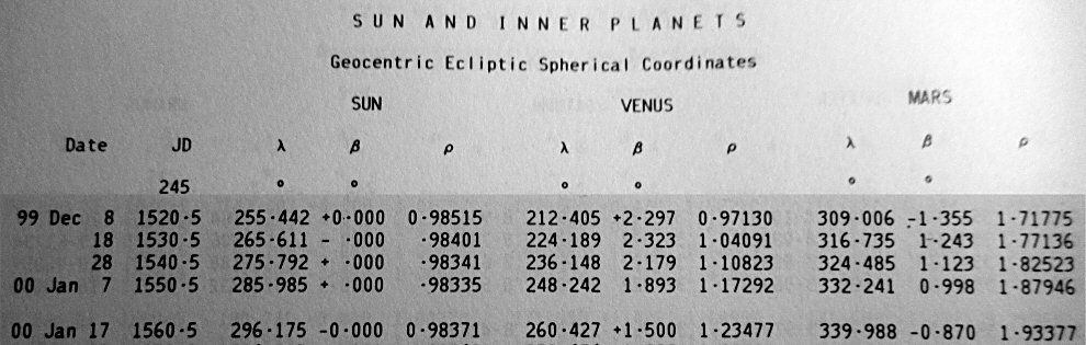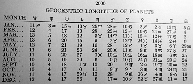 Temas pri tercentraj ekliptikaj koordinatoj por la komenco de jaro 2000. El la astrologia efemerido por januaro ni vidas la longitudojn de apuda tabelo.