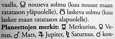 Ekzistas ankaŭ propraj simboloj por planedoj. Fotoj pri ili aperas apude. En astrologio fakte ankaŭ la Suno kaj la Luno estas planedoj - vagantaj lumoj de ĉielo. Iliaj simboloj ne aperas en ĉiuj la fotoj, sed mi supozas ke ili estas konitaj. La simbolon por la tria planedo - la Tero - ni ne bezonas ĉi tie, ĉar ni observas la ĉielon el la surfaco de la planedo.