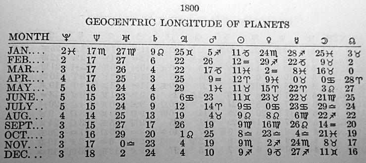 El la supra tabelo ni vidas ekzemple ke la tercentra ekliptika longitudo de planedo Jupitero ( ♃ ) estis en jaro 1800 en komenco de monato januaro (JAN): 25 ♊ kaj la planedo do tiam estis en la zodiaka signo Ĝemeloj, longitudo 60° + 25° = 85° (maldekstrumen el la tiama direkto de printempa ekvinokso). Latitudon la tabelo ne rakontas, sed ĝi estas proksime apud la ekliptiko. Samtempe estis la planedo Saturno ( ♄ ) en zodiaka signo Leono, longitudo 9 ♌ = 120° + 9° = 129°.