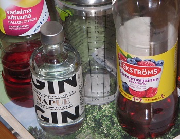 La 46,3% alkohola ĝino do enhavas la akvon kiun la koncentraĵo de suko bezonas. Sed kiom da ĝino oni miksu kun 1 parto de suko por atingi la perfektan miksaĵon? Kaj kia estos la alkohola procento de rezulto?