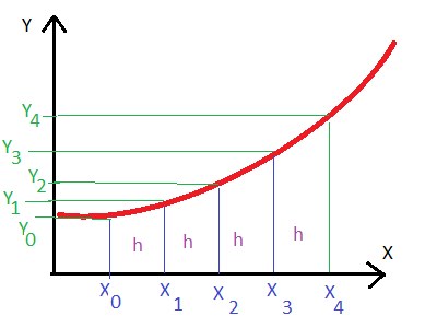 Alltså vi vet derivatan y' i början och vi vet också funktionens värde y där vi börjar, alltså y0, och vi vet alla x-värdena som vi kan fritt välja, men i början vet vi inte funktionens värde y för andra x-värden än x0 (fast kurvans lutning eller derivatan y' vi ju vet). Vi liksom inte ser den röda kurvan bredvid, vi bara vet hurudan är dess tangentens lutning i vissa punkter.