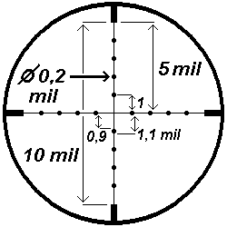 MILDOT-siktet har vinklar markerade med milliradianer. Hela skalan är 10 MIL. En vinkel av 0,1 MIL är mycket liten. Man kan knappast i praktiken ständigt skjuta noggrannare än så, för 0,1 MIL är bara 1 centimeter på 100 meters avstånd och bara 5 centimeter på 500 meter.